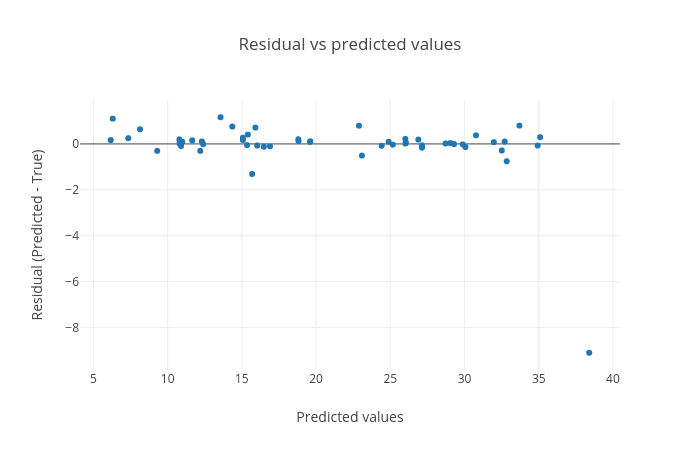 Figure 9: Residual plot between residual (predicted - true) and predicted targets. The plot shows a random pattern of points. For a good regression performance, this plot should exhibit a random pattern and the points should be symmetrically distributed along the y=0 line.