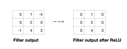 Open image in new tabAfter the filter scans the whole image, we apply an activation function to filter output to introduce non-linearlity. The preferred activation function used in CNN is ReLU or one its variants like Leaky ReLU (Nwankpa et al. 2018). ReLU leaves pixels with positive values in filter output as is, and replacing negative values with 0 (or a small number in case of Leaky ReLU). Figure 6 shows the results of applying ReLU activation function to a filter output.